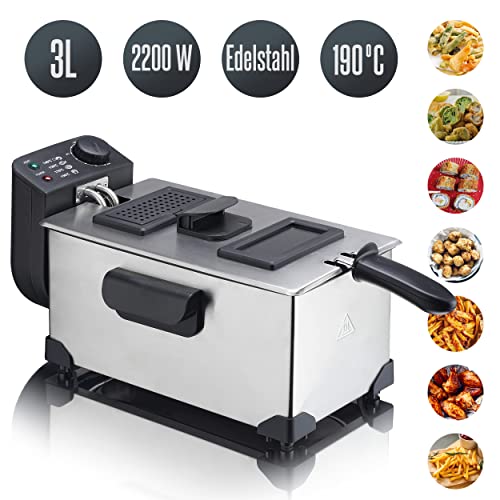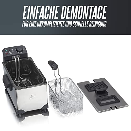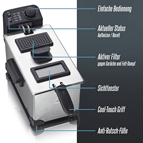 Specification: Heinrichs Fryer, Oil Fryer with 2200 W and 3 Litre Capacity, Cold Zone Fryer for Crispy Fries, Heat-Insulated Handles, Thermostat, Viewing Window, BPA-Free, Stainless Steel, Status Light LED