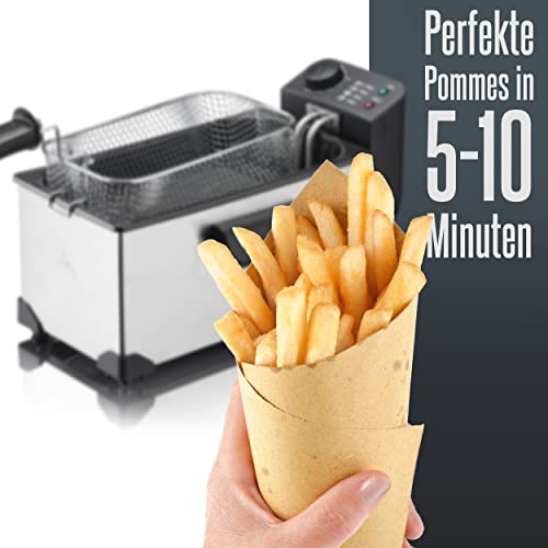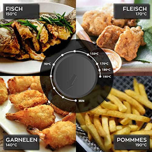 Easy to use: using the thermostatic temperature regulator, you can easily adjust the frying temperature. You can operate the temperature from 90 °C to 190 °C. You can fry, for example, at 140 °C shrimps, 150 °C fish, 170 °C meat and 190 °C chips.