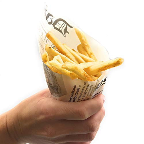 Box contents: you will receive 50 high-quality pom bags made of greaseproof paper, printed in the style of an English newspaper – suitable for approx. 250 g of fries