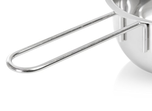Durch 1 Ausgießer auf jeder Seite ideal für Rechts- und Linkshänder geeignet, Leichtes Auflegen der gefüllten Schale in einen mit Wasser gefüllten Topf durch große Auflageraste und langen Griff